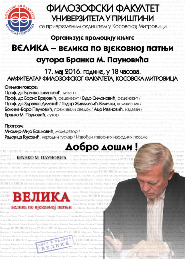 У амфитеатру Филозофског факултета 17. маја 2016. године у 18:00 сати одржана је промоција књиге ВЕЛИКА – велика по вјековној патњи аутора Бранка М. Пауновића. О књизи су говорили: Проф. др Бранко Јовановић – декан, Проф. др Борис Брајовић, рецензент Будо Симоновић, рецензент Проф. др Здравко Делетић, професор историје Тодор Живаљевић-Велички, књижевник Божина Боро Пауновић…