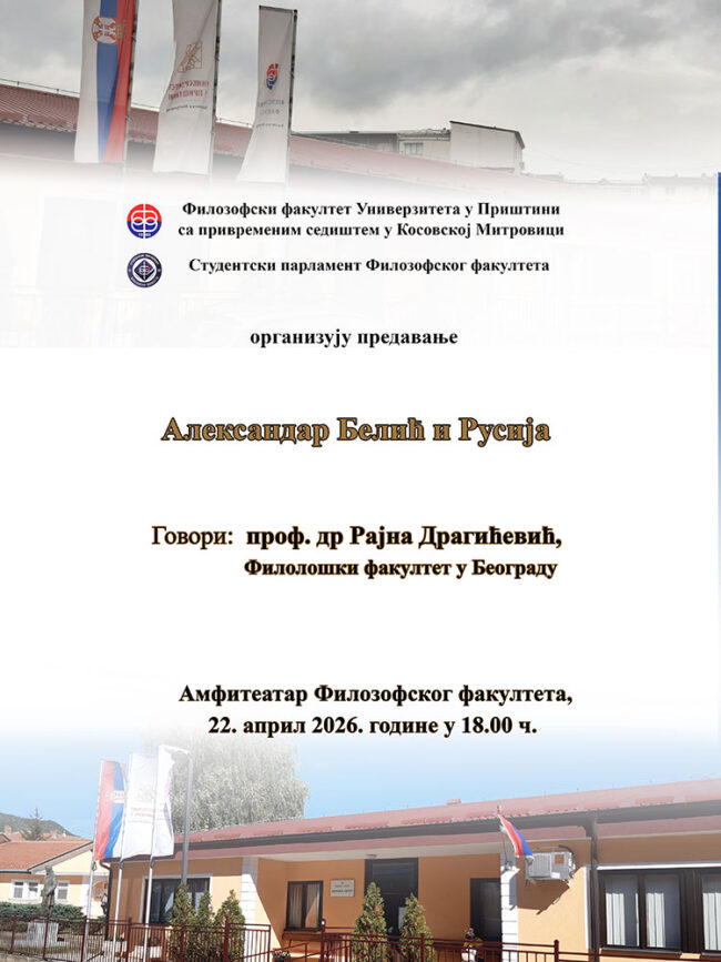 У среду, 22. априла 2026. године, са почетком у 18.00 ч., у амфитеатру Филозофског факултета, биће одржана трибина Александар Белић и Русија. На трибини ће говорити проф. др Рајна Драгићевић, редовни професор Филолошког факултета у Београду.