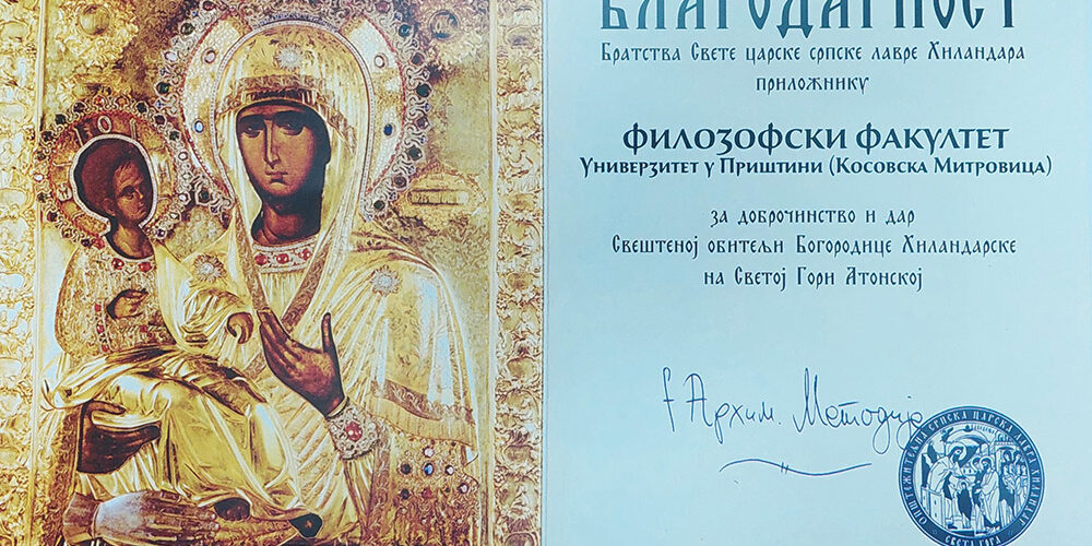 На адресу Филозофског факултета, 9. маја 2023. године, стигла је Благодарница Братства Свете царске српске лавре Хиландара за доброчинство и дар Свештеној обитељи Богородице Хиландарске на Светој Гори Атонској. Све раднике Филозофског факултета овај знак пажње чини и те како поносним.
