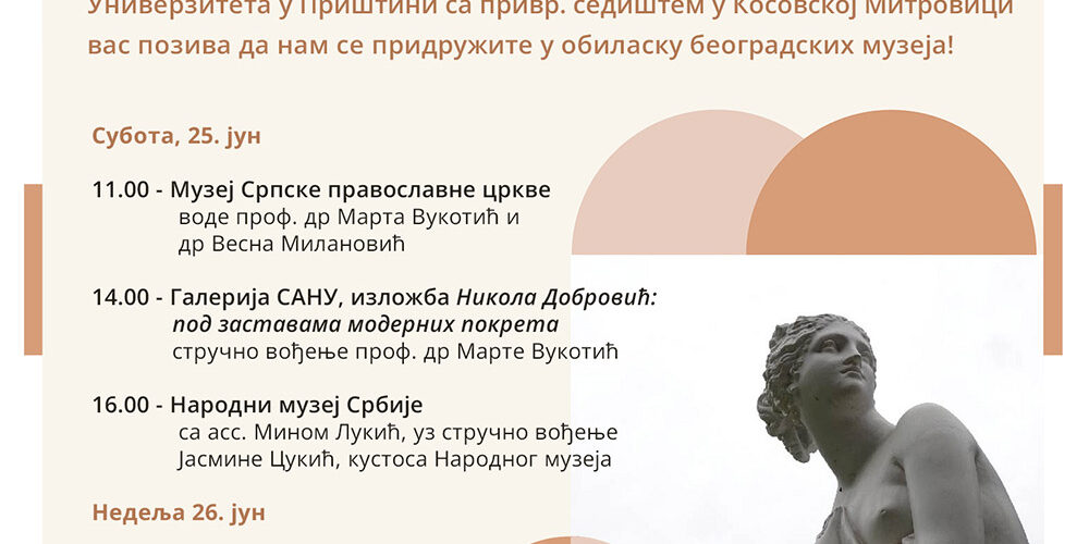 Катедра за историју уметности Филозофског факултета Универзитета у Приштини са привременим седиштем у Косовској Митровици организoваће низ стручних вођења у музејима у Београду 25. и 26. јуна 2022. године. Иако првенствено намењена студентима историје уметности, вођења су отворена за све који су заинтересовани за било коју од следећих активности: